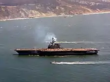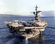 Coral Sea was decommissioned at the Puget Sound Naval Shipyard on 24 May 1957 to receive a major conversion (SCB 110A), which included a longer angled deck canted 3 degrees more than the previous overhauls of her sister ships. As the centerline elevators were relocated to the starboard deck edge forward and aft of the island, Coral Sea became the first carrier to mount an elevator on the port quarter resembling the more efficient deck layout of the Kitty Hawk-class then under construction. Other improvements included new steam catapults, an enclosed hurricane bow, hull blisters, and removal of the armor belt and several anti-aircraft guns.[1] Upon completion, she was recommissioned on 25 January 1960 and rejoined the fleet. During September 1960, she conducted training with her new air group along the West Coast, then sailed in September for a tour of duty with the Seventh Fleet in the Far East on her first WestPac (Western Pacific cruise). She recorded her 100,000th arrested landing in October 1961.[1]