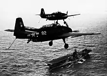 As Task Force 58 approached its targets on the morning of 30 March, its carriers launched a fighter sweep that shot down 30 Mitsubishi A6M Zero fighters already airborne and they were soon followed by 39 Grumman TBF Avenger torpedo bombers, each of which carried a pair of magnetic mines that effectively bottled up the 40-odd ships in Kossol Roads.[20] This was the first and only time that carrier aircraft laid mines during the Pacific War.[21] Despite reinforcing fighters that flew in overnight, the Americans sank 24 merchant and auxiliary ships, totaling nearly 130,000 gross register tons (GRT) of shipping, plus two old destroyers, four subchasers and a pair of repair ships on 30 and 31 March. American pilots claimed to have shot down 63 aircraft and destroyed over 100 more on the ground while losing 25 aircraft of their own. On their way back to Majuro, the carriers attacked targets on Woleai on 1 April to little effect.[22]