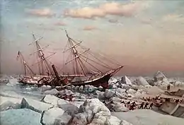 Jeannette departed San Francisco on 8 July 1879.[13] She sent her last communication to Washington from Saint Lawrence Bay, Chukotka, on 27 August.[14] Shortly afterwards she encountered ice, of increasing severity as she pushed her way forward to Herald Island.[15] On 7 September, she was caught fast in the ice at 71°35′N 175°6′E.[16][17] For the next 21 months, Jeannette drifted in an erratic fashion, generally to the northwest but frequently doubling back on herself.[18]