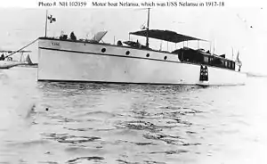 In 1917, the U.S. Navy acquired her under a free lease from her owner, John S. Kent, for use as a section patrol boat during World War I, and she was commissioned as USS Nelansu (SP-610). Sources disagree on the timing of these events, claiming acquisition dates of both 26 May[7] and 20 July[8] 1917; the only source to provide a commissioning date places it on 26 May 1917.[9]