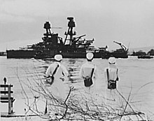 As of 6 December 1941, a Saturday, all of the Pacific Fleet's battleships were in port for the weekend for the first time since 4 July. Normally they took turns spending time in port, six would be out with Vice Admiral William S. Pye's battleship Task Force One one weekend, while the next weekend would find three ranging with Vice Admiral William Halsey, Jr.'s aircraft carrier task force. However, because Halsey could not afford to take the slow battleships with his fast carriers on his dash to reinforce Wake Island's Marine detachment with fighters and because it was Pye's turn to rest in port and the harbor was where it was considered safe, none of the battleships were sailing on that morning.[60] When the sun rose over Nevada on the 7th, the ship's band was playing "Morning Colors"; but planes then appeared on the horizon and the attack on Pearl Harbor began.[61]