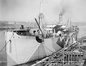 SS Ozaukee was built in 1918 as a commercial cargo ship by the Long Beach Shipbuilding Company at Long Beach, California, for the United States Shipping Board. Upon her completion in September 1918, the U.S. Navy acquired her from the Shipping Board on a bareboat charter basis. Assigned the naval registry identification number 3439, she was commissioned on 30 September 1918 as USS Ozaukee (ID-3439) at San Pedro, California, with Lieutenant Commander T. F. Shipsey, USNRF, in command.
