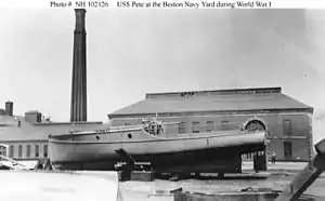 ![]() USS Pete (SP-596) hauled out of the water at the Boston Navy Yard at Boston, Massachusetts, sometime between April 1917 and March 1918. | |