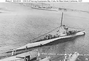 ![]() USS S-47 departing Guantanamo Bay, Cuba, in April 1927 bound for Mare Island Navy Yard, Vallejo, California. | |