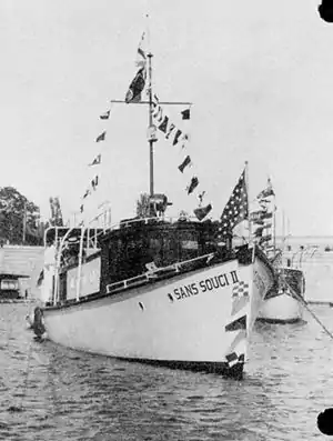 ![]() Sans Souci II in private use sometime between 1907 and 1917, prior to her U.S. Navy service. | |