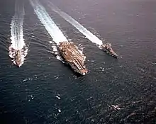 On 26 February 1980, Truxtun departed San Diego, CA for her eighth WESTPAC (western Pacific) deployment, this time as part of the USS Constellation Battle Group. In command was CAPTAIN E.M. Baldwin, USN. Truxtun participated in RIMPAC 1980, a large multi-national Naval exercise near the Hawaiian Islands in March 1980. After a brief stopover in Pearl Harbor, Truxtun continued westward, arriving at the US Naval Shipyard in Subic Bay, Philippine Islands for a brief maintenance period. Following this inport period, Truxtun continued into the Western Pacific and Indian Ocean, eventually serving for an extended period of time in the Persian Gulf during the Iranian Hostage Crisis. Toward the end of this deployment, which was extended due to operational requirements, Truxtun also made port calls in Subic Bay, Philippines, Pattaya Beach, Thailand and Wellington, New Zealand. On 15 October 1980, the cruiser returned to its homeport of San Diego.[7] Anti-nuclear protest boats greeted Truxtun at Wellington in 1980 and 1982.[8]