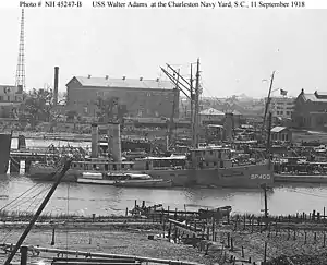 SS Walter Adams was a wooden-hulled steam fishing trawler built in 1890 by Robert Palmer and Son, of Noank, Connecticut, and rebuilt in 1898. The U.S. Navy inspected her for possible naval service in March 1917 and again in June 1918, and chartered her on 23 June 1918 for World War I service in the 6th Naval District. She was commissioned on 1 October 1918 as USS Walter Adams with Lieutenant, junior grade, Hugh G. Taylor in command. Photographs show that she had the designation "SP-400" painted on her bow and she was used as a patrol boat like other units with an "SP" designation during World War I, although her data card lists her as having Identification Number (Id. No.) 400, or "ID-400", the type of designation given to cargo ships, tankers, and transports taken up from civilian service for use during World War I.
