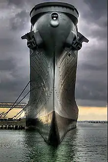 Throughout April 1956 and into May, Wisconsin operated locally off the Virginia Capes. On May 6, the battleship collided with the destroyer Eaton in a heavy fog; Wisconsin put into Norfolk with extensive damage to her bow, and one week later entered dry dock at the Norfolk Naval Shipyard.[14] A novel experiment sped her repairs and enabled the ship to carry out her scheduled midshipman training cruise that summer. A 120-ton, 68 foot (21 m) section of the bow of Wisconsin's incomplete sister ship Kentucky was transported by barge, in one section, from Newport News Shipbuilding and Drydock Corporation of Newport News, Virginia, across Hampton Roads to the Norfolk Naval Shipyard.[5] Working around the clock, Wisconsin's ship's force and shipyard personnel completed the operation which grafted on the new bow in 16 days. On June 28, 1956, the ship was ready for sea.[6][14]