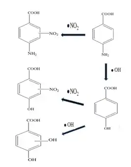 Zhou and Mopper showed that nitrate enhanced the photodegradation of PABA by a factor of 2. However, in the presence of free radical scavengers such as carbonate forms and natural organic matter (NOM), the photodegradation of PABA decreased. It was proposed that the indirect photolysis of PABA was mainly due to the NO3 photolysis product •OH.