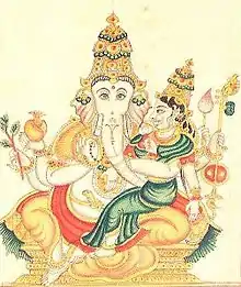Rao classifies Uchchhishta Ganapati as one of the five Shakti-Ganesha icons, where Ganesha is depicted with a shakti, that is, a female consort.[4] The large figure of Ganesha is accompanied with smaller figure of the consort.[1] The nude devi (goddess) sits on his left lap. She has two arms and wears various ornaments. In the Uttara-kamikagama, she is called Vighneshvari and is prescribed to be sculpted as a beautiful, young maiden. The fourth hand of Uchchhishta Ganapati touches the genitalia of the naked goddess. The Mantra-maharnava prescribes that the god should be depicted as though he is trying to have intercourse.[2]