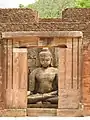 Numerous excavations by the Archaeological Survey of India (ASI) have been conducted at Udayagiri since 1958.[4] The Udayagiri Site 1, the first site to be excavated, is in a depression between two valleys.[2] In the excavations done during the period between 1985–86 and 1989–90, at the Udayagiri Site 2, the antiquities exposed consisted of a Buddhist Monastic complex enclosed within a compound wall, including a stupa of 7 metres (23 ft) height with four images of dhyani Buddhas fixed at its four cardinal points. On the basis of the epigraphical evidence archaeologist have inferred that this site is "Madhavapura Mahavihara". During the large excavation from 1997 to 2000, a second part of Udayagiri-2 was discovered with additional stupas and monasteries. These antiquities consist of two eighth century monastic complexes, statues of Buddha, Tara, Manjusri, Avalokiteśvara, Jatamukuta Lokesvara and many terracotta (earthenware) seals.[4] A stepped stone well with epigraphic inscriptions has also been discovered.[1] Also seen near one of the entry gates at the site is a human figure swinging on a rope, with eyes closed, in a state of perfect happiness.[2]