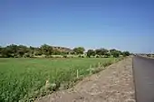 Udayagiri Caves are set in two low hills near Betwa River, on the banks of its tributary Bes River.[2] This is an isolated ridge about 2.5 kilometres (1.6 mi) long, running from southeast to northwest, rising to about 350 feet (110 m) height. The hill is rocky and consists of horizontal layers of white sandstone, a material common in the region.[15] They are about 6 kilometres (3.7 mi) west of the town of Vidisha, about 11 kilometres (6.8 mi) northeast of the Buddhist site of Sanchi, and 60 kilometres (37 mi) northeast of Bhopal.[16] The site is connected to the capital Bhopal by a highway. Bhopal is the nearest major railway station and airport with regular services.