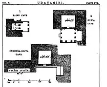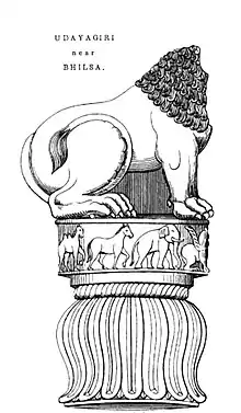 The Udayagiri Caves were first studied in depth and reported by Alexander Cunningham in the 1870s.[2] His site and iconography-related report appeared in Volume 10 of Tour Reports published by the Archaeological Survey of India, while the inscriptions and drawings of the Lion Capital at the site appeared in Volume 1 of the Corpus Inscriptionum Indicum. His comments that Udayagiri is an exclusively Hinduism and Jainism-related site, it being close to the Buddhist site of Sanchi and the Bhagavata-related Heliodorus pillar, and his dating parts of the site to between 2nd century BCE and early 5th century CE brought it to scholarly attention.[2][6]