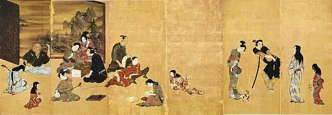 Around 1661, painted hanging scrolls known as Portraits of Kanbun Beauties gained popularity. The paintings of the Kanbun era (1661–73), most of which are anonymous, marked the beginnings of ukiyo-e as an independent school.[16] The paintings of Iwasa Matabei (1578–1650) have a great affinity with ukiyo-e paintings. Scholars disagree whether Matabei's work itself is ukiyo-e;[18] assertions that he was the genre's founder are especially common amongst Japanese researchers.[19] At times Matabei has been credited as the artist of the unsigned Hikone screen,[20] a byōbu folding screen that may be one of the earliest surviving ukiyo-e works. The screen is in a refined Kanō style and depicts contemporary life, rather than the prescribed subjects of the painterly schools.[21]