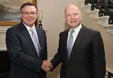 Since the beginning of 2014 the following meetings have taken place: the meeting between Prime Minister of Ukraine Arseniy Yatseniuk and British Foreign Secretary William Hague during the FS visit to Ukraine (3 March), Prime Minister Arseniy Yatseniuk's meeting with UK Prime Minister David Cameron on the sidelines of the EU Summit in Brussels (6 March); meeting between the President of Ukraine Petro Poroshenko with the UK Prime Minister David Cameron during the commemorations of 70th anniversary of the Normandy landings, as well as a number of meetings at the level of foreign ministers of the two countries (3 March, 7 May, 23 June).[3]