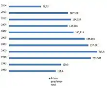 The country's prison system was the responsibility of the Ministry of Internal Affairs until 1998, when it was placed under the newly created State Penal Department. In December 2010 it was reorganized as the State Penitentiary Service of Ukraine, which is directed by the Ministry of Justice.[6] It is responsible for the execution of criminal sentences within the Ukrainian prison system. There are 177 penal institutions in Ukraine (for January 1, 2015 - 31 pre-trial detention prisons, 139 penal facilities of different levels of security, six corrective penal settlements for minors). On 1 January 2015, the prison population numbered 73,431 people (162 prisoners per 100,000 people, down from 347 per 100,000 people in July 2011).[7][8] Approximately one-sixth are remanded prisoners. The Department of Criminal Executive Inspection has 87,581 convicts who are sentenced to criminal punishments alternative to imprisonment. In February 2000, Ukraine abolished the death penalty, which had been abandoned since March 1997. 1,906 inmates are sentenced to life imprisonment. Development of the State Probation Service has begun.