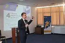 The Ukrainian Galician Party (Ukrainian: Українська Галицька партія, romanized: Ukrayins'ka Halyts'ka partiya) or UHP (Ukrainian: УГП) is a Christian Democratic political party[3] active in the western Ukrainian region of Galicia, which consists of Lviv, Ivano-Frankivsk, and Ternopil oblasts. It was registered in the aftermath of the Revolution of Dignity in 2014 to pursue the implementation of Euromaidan's original goals, and became politically active in 2015.[4]