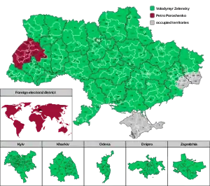 The 2019 Ukrainian presidential election was held on 31 March and 21 April in a two-round system. There were a total of 39 candidates for the election on the ballot. The 2014 annexation of Crimea by Russia and the occupation of parts of Donetsk Oblast and Luhansk Oblast prevented around 12% of eligible voters from participating in the election. As no candidate received an absolute majority of the vote, a second round was held between the top two candidates, Volodymyr Zelensky, who played the role of Ukraine's president in a popular television comedy and the incumbent president, Petro Poroshenko, on 21 April 2019. According to the Central Election Commission, Zelensky won the second round with 73.22% of the votes.[27][28]