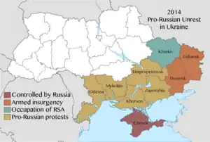President Yanukovych was forced to flee on 23 February 2014, and protests by pro-Russian and anti-revolution activists began in the largely Russophone region of Crimea.[19] These were followed by demonstrations in cities across eastern and southern Ukraine, including Donetsk, Luhansk, Kharkiv, and Odessa.