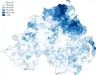 In the 2011 census of Northern Ireland, 16,373 people (0.9% of the population) stated that they can speak, read, write and understand Ulster Scots and 140,204 people (8.1% of the population) reported having some ability in Ulster Scots.[31]