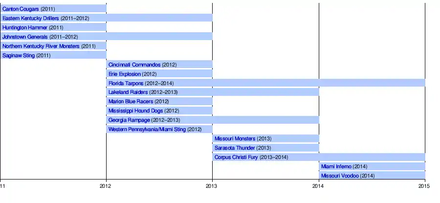 | 2011 | 6 | Canton Cougars Eastern Kentucky Drillers Huntington Hammer Johnstown Generals Northern Kentucky River Monsters Saginaw Sting |
