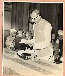 In 1954 March, Umashankar Joshi was appointed as Member of the General Council and the executive committee of Sahitya Akademi from its inception.[5] In June, he was appointed as professor of Gujarati Literature at Gujarat University. He was also appointed the head of School of languages in that university. Joshi continued to work in the same university till his retirement in 1972.[3][6] In 1956, he toured America and England as a member of a committee sent by the Indian Government to study the activities of 'General Education' in American and some British Universities. In 1964, he became a member of a committee appointed by the Government of Gujarat for the establishment of South Gujarat and Saurashtra Universities. In 1964, Joshi presided convention of "Gujarat Sahitya Parishad" in Delhi.[5] From 30 November 1966: he was Vice-Chancellor of Gujarat University and worked in this position till 1972.[9]