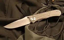 The Umnumzaan is a folding pocket knife manufactured by Chris Reeve Knives of Boise, Idaho, and designed by Chris Reeve. The name "Umnumzaan" is derived from the Zulu language, meaning "Head of the family," or "Boss" (colloq.), a tribute to Mr. Reeve's South Africa origins.[1] The Umnumzaan was designed to meet the needs of operators seeking a heavy-duty folder capable of handling heavy use and even abuse. Building upon the Sebenza’s success, the Umnumzaan features: a stronger pivot joint, a thicker blade, a different blade grind with a reinforced tip, improved ergonomics, thicker titanium handles, a thicker titanium lock bar, a stronger ceramic ball detent system, a larger titanium spacer (sometimes called a “stand off”), a phosphor-bronze washer system designed to act as a ‘dry-sump’ to retain lubrication and keep dirt out, an oversized ambidextrous-thumb studs & extended lock bar to aid operation when wearing gloves, a lanyard pivot joint that uses pivoting lanyard tie bars, and a deeply textured grip.