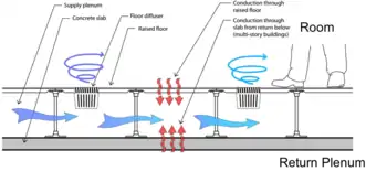 Underfloor air distribution (UFAD) is an air distribution strategy for providing ventilation and space conditioning in buildings as part of the design of a HVAC system. UFAD systems use an underfloor supply plenum located between the structural concrete slab and a raised floor system to supply conditioned air through floor diffusers directly into the occupied zone of the building. UFAD systems are similar to conventional overhead systems (OH) in terms of the types of equipment used at the cooling and heating plants and primary air-handling units (AHU).[1] Key differences include the use of an underfloor air supply plenum, warmer supply air temperatures, localized air distribution (with or without individual control) and thermal stratification.[2] Thermal stratification is one of the featured characteristics of UFAD systems, which allows higher thermostat setpoints compared to the traditional overhead systems (OH). UFAD cooling load profile is different from a traditional OH system due to the impact of raised floor, particularly UFAD may have a higher peak cooling load than that of OH systems. This is because heat is gained from building penetrations and gaps within the structure itself.[3] UFAD has several potential advantages over traditional overhead systems, including layout flexibility, improved thermal comfort and ventilation efficiency,[4] reduced energy use in suitable climates and life-cycle costs. UFAD is often used in office buildings, particularly highly-reconfigurable and open plan offices where raised floors are desirable for cable management. UFAD is appropriate for a number of different building types including commercials, schools, churches, airports, museums, libraries etc.[5] Notable buildings using UFAD system in North America include The New York Times Building, Bank of America Tower and San Francisco Federal Building. Careful considerations need to be made in the construction phase of UFAD systems to ensure a well-sealed plenum to avoid air leakage in UFAD supply plenums.