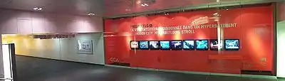 Most recently, in 2003, the complete redevelopment of the Quartier international de Montréal consolidated several segments of the central underground city with continuous pedestrian corridors. The construction of the ICAO headquarters joined Place Bonaventure to Square-Victoria-OACI station, which in turn was joined to the Palais des Congrès and Place-d'Armes station via the new Caisse de dépôt et de placement building and a tunnel under Place Jean-Paul Riopelle. Uniquely, the new tunnel sections in the Quartier International contain educational and artistic displays sponsored by major Montreal museums. As a result of this construction, one can now walk all the way across the centre of downtown, from the UQAM Sherbrooke Pavilion at the corner of Sainte Famille Street and Sherbrooke Street to the Lucien-L'Allier Metro station just south-west of the Bell Centre, without going outside — a span of 1.7 km (1.1 mi) as the crow flies, or approximately 3 kilometres (2 mi) walking distance.