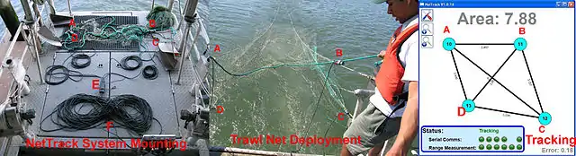 In recent years, several trends in underwater acoustic positioning have emerged. One is the introduction of compound systems such the combination of LBL and USBL in a so-called LUSBL[19] configuration to enhance performance. These systems are generally used in the offshore oil & gas sector and other high-end applications. Another trend is the introduction of compact, task optimized systems for a variety of specialized purposes. For example, the California Department of Fish and Game commissioned a system (figure 4), which continually measures the opening area and geometry of a fish sampling net during a trawl. That information helps the department improve the accuracy of their fish stock assessments in the Sacramento River Delta.
