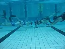 Underwater hockey (UWH), also known as Octopush (mainly in the United Kingdom) is a globally played limited-contact sport in which two teams compete to manoeuvre a puck across the bottom of a swimming pool into the opposing team's goal by propelling it with a hockey stick or pusher). A key challenge of the game is that players are not able to use breathing devices such as scuba gear whilst playing, they must hold their breath. The game originated in England in 1954 when Alan Blake, a founder of the newly formed Southsea Sub-Aqua Club, invented the game he called Octopush as a means of keeping the club's members interested and active over the cold winter months when open-water diving lost its appeal.[1][2] Underwater hockey is now played worldwide, with the Confédération Mondiale des Activités Subaquatiques, abbreviated CMAS, as the world governing body.[3] The first Underwater Hockey World Championship was held in Canada in 1980 after a false start in 1979 brought about by international politics and apartheid.