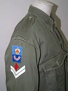 New Zealand adopted Australian JGs from 1967 and were initially supplied from 1 ATF stocks. Subsequent New Zealand-made JGs were made with one difference in that the shirt pocket flaps were V-shaped and the pockets pleated, otherwise they were identical. In 1968, the Australian military replaced the straight breast pockets of their field shirts with slanted pockets and the shirt was designed to be worn outside of the trousers, in the style of American jungle fatigues. Additional pockets were placed on the upper sleeves of the shirt. The Australian soldiers nicknamed this updated uniform the "pixie suit" (for the slant of the pockets resembling pixie ears.)[19] The new uniform was adopted by both Australian and New Zealand forces but both remained in use, depending on supply.[20] The New Zealand-issue "pixie suits" were made in New Zealand.[21][22][23]