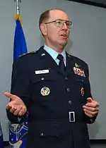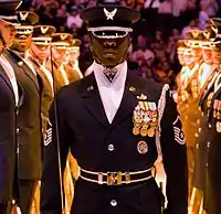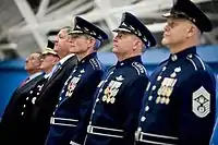 The Mess dress uniform is worn to formal or semi-formal occasions such as Dinings-in, Dinings-out, the annual Air Force Ball, weddings and other formal functions where civilian "black tie" would be prescribed. Until the early 1980s, this uniform differed from the current version, previously consisting of separate mess jackets, a white mess jacket worn in spring and summer and a black mess jacket worn in fall and winter, combined with black trousers and ties for males and an options of a black cocktail length or black evening-length skirt for females. Black cummerbunds for males and females and white and black service hats for males were also prescribed, although wear of these hats was often optional. The current mess dress uniform in use since the early/mid-1980s consists of a dark blue mess jacket and mess dress trousers for males and a similar color evening-length skirt for females. As of August 2020, females have the option to wear mess dress trousers.[15] The jacket features ornate silver buttons, and is worn with the service member's awarded medals in miniature size, wings in miniature size, or other specialty insignia over the left breast, command insignia over the right breast for colonels and below (if applicable), satin air force blue bow-tie for males or tab for females, and a satin air force blue cummerbund. Cufflinks are to be either shined or flat round silver or have the air force star and wing emblem, dark blue suspenders may also be worn, but remain hidden while the jacket is on. Commissioned officers, USAFA and AFROTC cadets, and OTS officer trainees wear hard shoulder epaulets (i.e., shoulder boards) similar to those worn by commissioned officers of the U.S. Navy. Cadets and officer trainees wear insignia on their shoulder boards as applicable to their pre-commissioning rank position in their respective officer accession programs. Commissioned officer shoulder boards for colonels and below feature an officer's rank insignia in raised metallic thread, bordered by two silver vertical metallic stripes similar to sleeve braid. General officers wear shoulder boards covered nearly the entire length and width in a silver metallic braid, with silver stars in a raised metallic thread in number appropriate to their rank. Enlisted personnel typically wear the same large rank insignia that they would wear on their service dress coats. Officers also wear a single silver metallic sleeve braid on the lower sleeves of the Mess Dress coat, with sleeve braid coming in two widths, in a 1/2 inch width for colonel and below, and in a 3/4 inch width for Brigadier General and above. Enlisted personnel normally wear no sleeve braid. No hat or nametag is worn with the Air Force Mess Dress Uniform.[14]