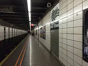 As part of the renovation project, the station's platforms were extended 85 feet (26 m)[7] to the north,[22] and the station's elaborate mosaic tile walls were covered over with 8-by-16-inch (20 by 41 cm) white cinderblock tiles. The latter change, which was also made to 15 other stations on the BMT Broadway and Fourth Avenue Line, was criticized for being dehumanizing. The NYCTA spokesman stated that the old tiles were in poor condition and that the change was made to improve the appearance of stations and provide uniformity. Furthermore, it did not consider the old mosaics to have "any great artistic merit".[23]