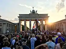 ![]() Rally participants preparing to enter Lee Park in Charlottesville, Virginia on August 12, 2017, carrying Neo-Confederate flags, Confederate battle flags, Gadsden flags, a Nazi flag and a flag depicting Mjölnir | |