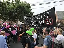 Those who marched in opposition to the rally were unified in opposition to white supremacy, but "espoused a wide array of ideological beliefs, preferred tactics and political goals. A large number were ordinary residents of Charlottesville who wanted to show their disdain for white supremacist groups, particularly after the Ku Klux Klan held a rally in the city on July 8."[99] Ahead of the rally, an array of "faith-based groups, civil rights organizations, local businesses, and faculty and students at the University of Virginia" planned counterprotests.[47] In July 2017, the ecumenical and interfaith clergy group Congregate Charlottesville called for a thousand members of the clergy to counterprotest at the rally.[61][100] The Charlottesville House of Prayer also gathered at the site to pray. Groups counterprotesting included representatives from the National Council of Churches,[101] Black Lives Matter,[102] Anti-Racist Action,[103] the Democratic Socialists of America,[104] the Workers World Party,[105] the Revolutionary Communist Party,[106] Refuse Fascism,[107] Redneck Revolt,[108] the Industrial Workers of the World,[109][110] the Metropolitan Anarchist Coordinating Council,[111] and Showing Up for Racial Justice.[103][112][113] Members of the antifa movement were also in attendance.[23] Some counter-protesters came armed.[114]