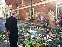 On May 13, 2017, white supremacist Richard Spencer led a nighttime rally in Charlottesville to protest the city's plans to remove the statue of Lee. The event involved over 100 protesters, from various alt-right groups from around the country, chanting "Jews will not replace us!"[53] and "Russia is our friend!" while holding lit torches near the statue, a spectacle which many Charlottesville residents found intimidating, and which the mayor denounced as a "harken[ing] back to the days of the KKK."[54][55] The next night, hundreds of anti-racist Charlottesville residents held a candlelight counterprotest in response.[56] Throughout early to mid-2017, tensions mounted as neo-Confederate and alt-right groups' sporadic gatherings in Charlottesville's downtown parks and pedestrian mall were confronted by anti-racist activists, resulting in occasional scuffles and some arrests.[57][58][59] On July 8, 2017, the Loyal White Knights of the Ku Klux Klan, a group from Pelham, North Carolina, held a rally at the Stonewall Jackson statue in Charlottesville.[60] In opposition to the rally, the Charlottesville Clergy Collective created a safe space two blocks from the Klan rally at First United Methodist Church, which was used by over 600 people.[60] About 50 Klan members were drowned out by 1,000 counterprotesters (including 23 civil disobedience activists arrested for attempting to block the Klan group's entry into the park), who gathered at a loud but nonviolent rally dubbed by anti-racist organizers as the "#BlocKKKParty."[61][62] After the Klan group's departure, however, the Charlottesville Police Department declared the remaining counterprotesters to be an unlawful assembly, and ordered their dispersal—an order which, given the din of the crowd and the police helicopter hovering overhead, went unheard by many in the crowd. Although the Charlottesville chief of police had denied permission for the measure, the Virginia State Police acted upon an unapproved order and fired three tear gas canisters into a retreating group of counterprotesters. Police and city government officials later defended the action, which anti-racist counter-demonstrators and legal observer organizations characterized as police brutality. The resulting mistrust between law enforcement and local activists clouded the remainder of the summer, setting the stage for the August 12 Unite the Right rally.[63][64]