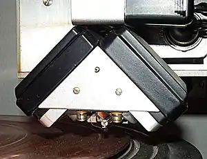 The developments at Decca forced EMI to speed up their half-hearted effort.[92] The management believed that stereo recording technology was still unreliable, and refrained from rushing stereo records into production.[33] Instead, in 1957 the company released an expensive intermediate format – prerecorded Stereosonic magnetic tapes.[90][33][93] The proprietary recording technique was developed by Blumlein's former colleagues Vanderlyn, Clark and Dutton, and relied on the use of XY Blumlein pairs and Blumlein shufflers that introduced crosstalk at frequencies above 700 Hz.[90][33][93][94] Shuffling was intended to equalize high-frequency and low-frequency sound localization, however, it was a poor match to practical studio environment at Abbey Road.[95] The tapes were too expensive for the consumer market and were soon discontinued.[93]