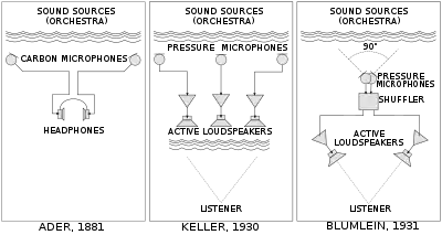 In 1881 Clément Ader presented the Théâtrophone – a working system for live delivery of opera performances over telephone lines.[2][3][4] The théâtrophone was a one-to-one network, employing one carbon microphone to energize one remote telephone receiver, and required rows of microphones placed along the stage.[5] While experimenting with parallel lines, Ader accidentally discovered stereo effect. By placing pairs of microphones at either side of the stage, near the footlights, Ader achieved strong binaural sound localization, simulating the effect of sitting at the edge of the stage, hearing actors and instruments as if they were spread in front of the listener.[6] Ader himself explained the effect as the result of the differences in apparent loudness registered by the ears of the listener.[7] Binaural théâtrophone, advertized as "auro-stereroscopic"[7] or "binaural audition"[5] failed to attract customers due to the need to have two telephone lines per subscriber, and overall low fidelity. Conventional, monaural théâtrophone operated successfully in France, Hungary, Italy and the United Kingdom until the end of the 1920s.[3][4][8]