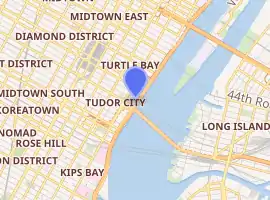 The United Nations Secretariat Building is a 505-foot (154 m) tall skyscraper and the centerpiece of the headquarters of the United Nations, in the Turtle Bay/East Midtown neighborhood of Manhattan in New York City. The lot where the building stands is considered to be under United Nations jurisdiction, although it remains geopolitically located within the United States.[3] It is the first skyscraper in New York City to use a curtain wall.[4]