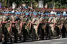 In 2007, a peacekeeper volunteer was required to be over the age of 25 with no maximum age limit.[7] Peacekeeping forces are contributed by member states on a voluntary basis. As of 30 June 2019, there are 100,411 people serving in UN peacekeeping operations (86,145 uniformed, 12,932 civilian, and 1,334 volunteers).[8] European nations contribute nearly 6,000 units to this total. Pakistan, India, and Bangladesh are among the largest individual contributors with around 8,000 units each. African nations contributed nearly half the total, almost 44,000 units.[9]