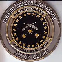 The emblem of the Firing Party element was created in 2000 by Technical Sergeant Timothy Carney, then-NCOIC of the Firing Party element. Symbolically, the colors of yellow, black and gray represent the components of gunpowder: yellow for sulphur, black for charcoal and gray for potassium nitrate. The crossed rifles represent the primary weapon of the Firing Party and the three seven-pointed star-bursts represent three volleys of seven fired in unison. The twenty-one stars that encircle the emblem represent twenty-one rounds fired in honor of a fallen service-member. The motto, "Excolo Per Ignis" is Latin for "to honor by fire" which is the primary duty of the Firing Party element.