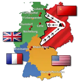 The European Air Transport Service (EATS), built around the 51st Troop Carrier Wing, controlled C-46, Douglas C-47 Skytrain and C-54 transport aircraft and provided passenger and cargo transport within Western Europe. Its headquarters was at Wiesbaden. It initially controlled the former IX Troop Carrier Command squadrons which remained after the war. EATS operated both cargo and personnel transport routes in non-Communist controlled areas to support the American, British and French occupation forces, along with units in Greece (Athens Airport) and Italy.[10] Known EATS facilities were: