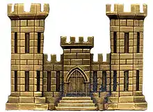 The Corps of Engineers branch insignia, the Corps Castle, is believed to have originated on an informal basis. In 1841, cadets at West Point wore insignia of this type. In 1902, the Castle was formally adopted by the Corps of Engineers as branch insignia.[42] The "castle" is actually the Pershing Barracks at the United States Military Academy in West Point, New York.[43]