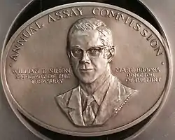 Early assay medals featured on the obverse a bust of Liberty or figure of Columbia, and on the reverse a wreath surrounding the words "annual assay" and the year.[62] The 1870 obverse, by Longacre's successor William Barber, features Moneta surrounded by implements of the assay, such as scales and the pyx.[63] The distinctive designs for each year would sometimes be topical—the 1876 medal bears a design for the centennial of American Independence, and 1879's depicted the recently deceased Mint Director Henry Linderman. Beginning in 1880, they most often featured the president or Treasury Secretary. The medals in 1901 and from 1903 to 1909 were rectangular, a style popular at the time.[64] The 1920 reverse, by Engraver George T. Morgan, had a design which symbolized the ending of World War I; in 1921, an extra medal was struck in gold, given by the assay commissioners to outgoing President Woodrow Wilson as a mark of respect.[65]