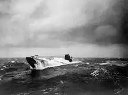 New York's ordeal was not over, however. Badly damaged by the loss of a propeller, the ship sailed to Rosyth under heavy escort for repairs on 15 October. At 01:00 the next morning, a U-boat launched three torpedoes at the damaged vessel, all of which passed ahead of her.[57] Unlike in previous cases, sufficient evidence existed to suppose that this torpedo attack was not a false alarm—a number of officers and men aboard New York clearly saw the wakes of the torpedoes in the full moonlight, and a submarine was spotted in the immediate vicinity by a patrol shortly after the attack.[58][A 2]
