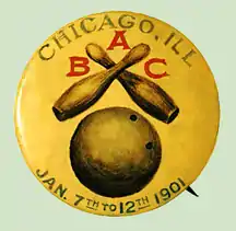 Moses Bensinger was influential in setting up the American Bowling Congress (A.B.C.) in 1895.[7][8][9][10][11][12] On September 9, 1895, the A.B.C. was officially formed as a permanent organization at Beethoven Hall on east Fifth Street in New York City.[13][14] The A.B.C. had their first formal annual meeting four days later on September 13 at the Elephant club on Fulton Street in Brooklyn and adopted the proposed constitution and by-laws.[15] The new organization took effect officially on October 15, 1895.[16] It is a legislative body that enforces uniform bowlers' rules and regulations,[17][18][19] through a set of by-laws and a constitution of Articles,[20] for all in the United States to follow as the official standard for ten-pin bowling.[21][22][23][24] Before the USBC's existence, the A.B.C. standardized and governed all tenpin bowling equipment as well for the modern sport, through to the time of consolidation under the USBC.[25] It is much like the baseball National League and the Bicycle law in the United States.[18] This was a codification of the preexisting rules and regulations through the by-laws of the American Bowling Congress.[26] It eliminated gambling on contests, as prize money could now be earned honestly in tournaments.[27][28] This was done by a uniform method of scoring that was enforceable by the A.B.C. bowling laws that then made it fair for all bowlers throughout the United States.[29][30][31][32] Bowling equipment made by the Brunswick Company, like the alleys, pins and balls, were uniform based on certain measurements and requirements set in place by the American Bowling Congress.[33][34][35][36] All the large national bowling centers with regulation Brunswick equipment - and much later, in the era of the automatic pinspotter, the AMF firm - were under the constitution and by-laws of the A.B.C. organization by 1905.[37][38][39]