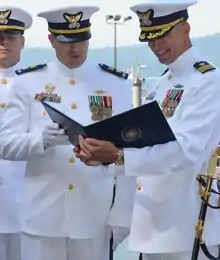 Commissioned officers in the Coast Guard hold pay grades ranging from O-1 to O-10 and have the same rank structure as the Navy.[51][52] Officers holding the rank of ensign (O-1) through lieutenant commander (O-4) are considered junior officers, commanders (O-5) and captains (O-6) are considered senior officers, and rear admirals (O-7) through admirals (O-10) are considered flag officers. The Commandant of the Coast Guard and the Vice Commandant of the Coast Guard are the only members of the Coast Guard authorized to hold the rank of admiral.[53]