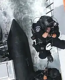 Title 14 USC, section 2 authorizes the Coast Guard to enforce U.S. federal laws.[33] This authority is further defined in 14 U.S.C. § 522, which gives law enforcement powers to all Coast Guard commissioned officers, warrant officers, and petty officers.[34] Unlike the other branches of the United States Armed Forces, which are prevented from acting in a law enforcement capacity by 18 U.S.C. § 1385, the Posse Comitatus Act, and Department of Defense policy, the Coast Guard is exempt from and not subject to the restrictions of the Posse Comitatus Act.[35]