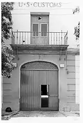 The facades are similar with regular door and window openings and with small balconies to the second-floor openings. There is a small partial false gable roof of Spanish barrel red-clay tiles around the four sides and around the courtyard. On the front (south) facade, facing the ocean, there are five bays with a large elliptical arch-headed passageway large enough for vehicular traffic. It is architecturally marked only by a plain, flat frame painted differently from the body of the building. There are plain board, double doors with a smaller pedestrian port in the right door. In the elliptical arch there is a simple fanlight window. Flanking the arched entrance are two large high windows on each side. The windows are two-leaf casements with exterior solid and Jouvered combination paneled shutters. Metal grilles are at each window. The walls have a simple low projecting base course, and the first floor walls are marked by horizontal incised coursing, all in stucco. There is a large molded string course between stories and on the second floor, five door openings, each with double-leaf doors that are half sash, which replaced the original louvered and paneled shutter combinations. Over the doors are sashed transoms, although the right group has been replaced by air conditioners. Each opening has a decorative wrought iron balcony with scroll support dating from the U.S. remodeling of the building. Previous to these wrought-iron balconies, the building had cast iron railings. "U.S. Customs" is lettered over the central window. At the top is a large double masonry molded cornice, surmounted by the small false partial gable in Spanish tiles, both from 1924. On the front only, there are three flag poles on the roof, and a large antenna system. On each side of the first floor passage entry is an alarm box and a plain light fixture.[8]